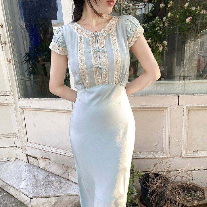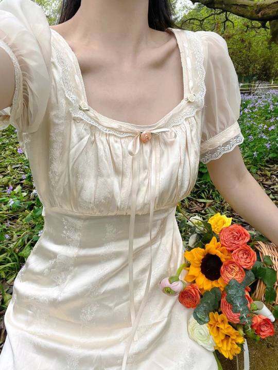 古着vintage法式气质连衣裙女夏小众独特设计感蕾丝复古少女长裙
