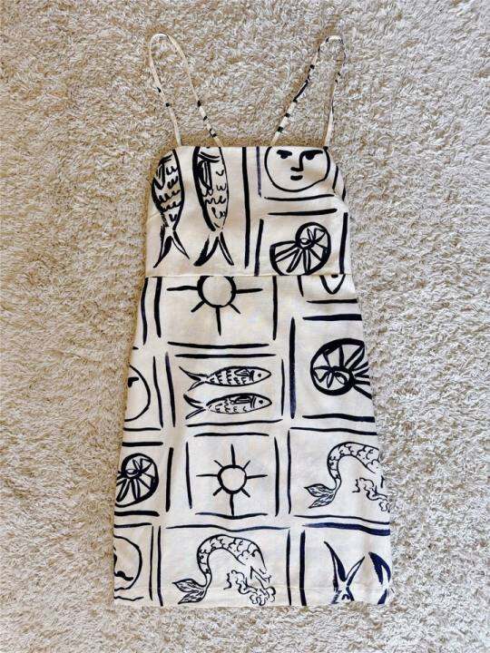 巴西单HER*NG高级度假风撞色手绘涂鸦露背绑带设计含亚麻连衣裙