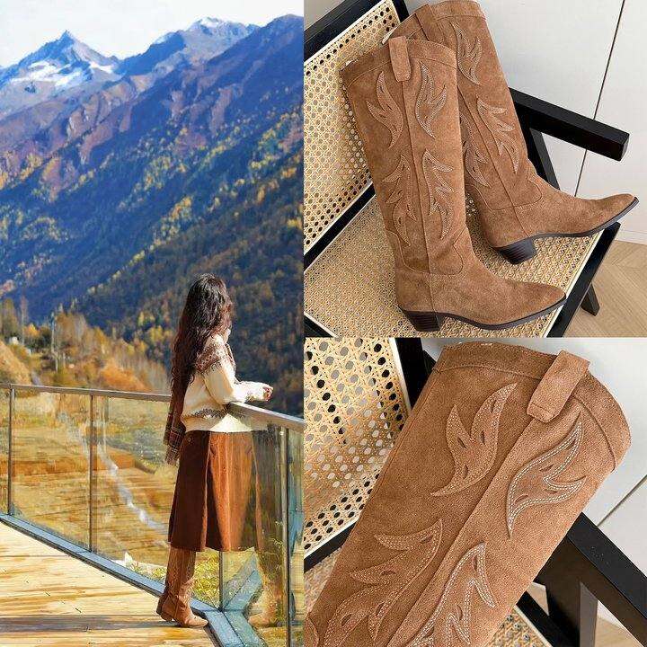 西班牙z家 gw1000+全真皮刺绣西部牛仔靴不过膝靴大码牛皮女靴42