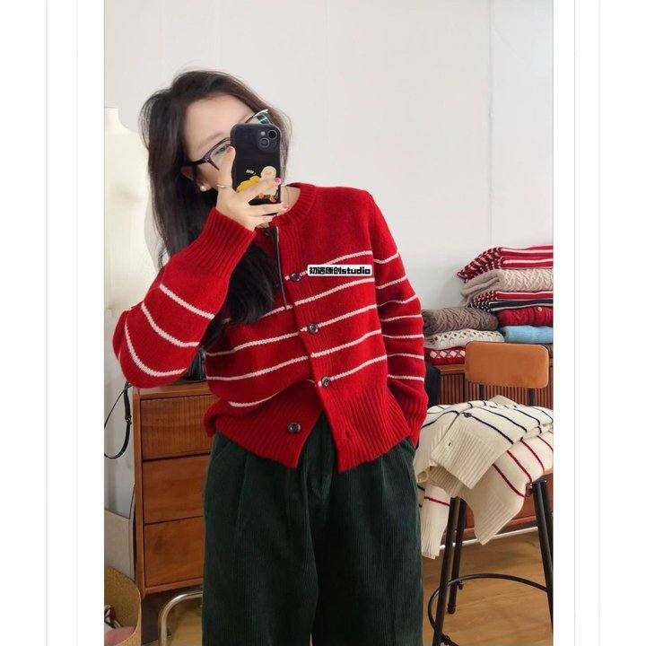 初遇圣诞主题复古红色条纹毛衣100纯羊毛柔软保暖显白叠穿开衫女
