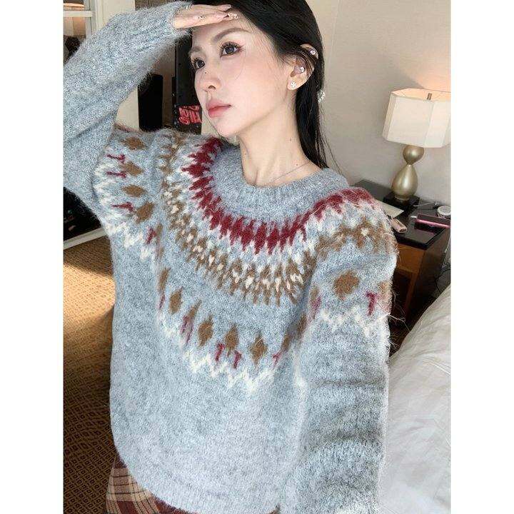 小象【圣诞费尔岛】北欧复古加厚套头撞色毛衣女冬季设计感针织衫