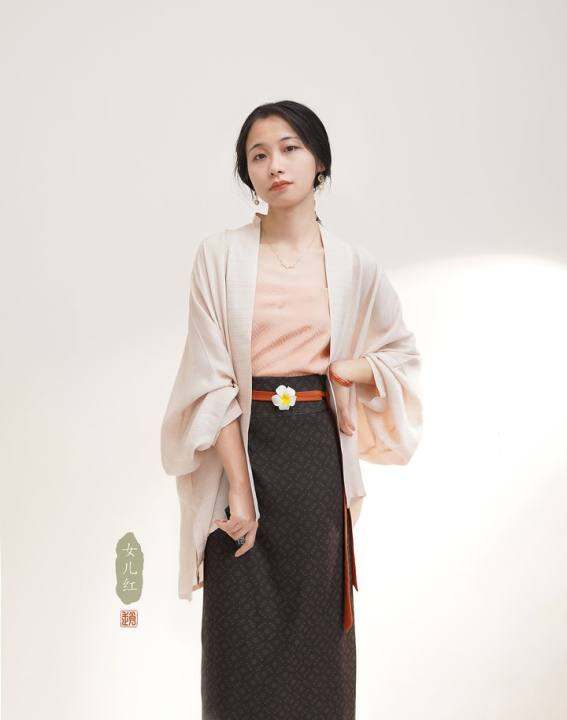 今天终于穿上了女儿红!真的真的太好看了!原本一直都半草不草的,感觉花色显老。后来想着反正现在88vip都有运费险就买了。到手后就知道为什么这么火了!非常非常非常轻薄,搭上民间官搭森唐的茶红吊带,然后又尝试搭配了闲时雨的花语对襟短衫(抢的错版5折),非常好看,同事都问我是不是瘦了哈哈哈哈,人看起来长长的一条。我们这都没人穿汉服,今天大家都说也想买来试试,向我要了链接。