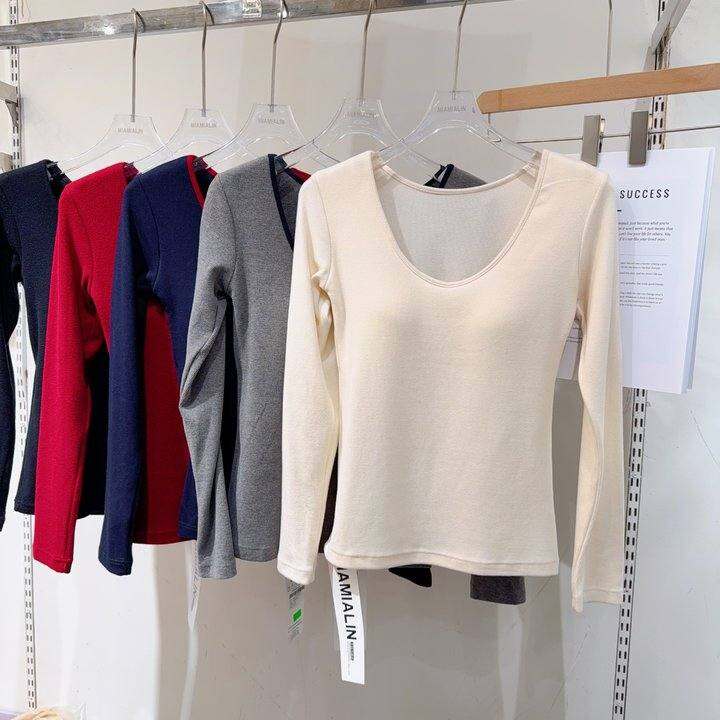 米娅林6662秋冬撞色磨毛保暖内搭女显瘦U领一体杯打底衫长袖上衣