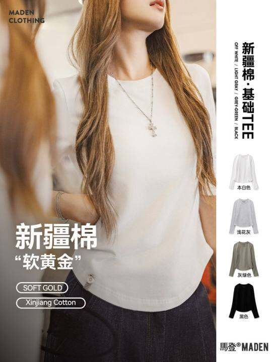 马登新疆棉黑白色基础款正肩磨毛修身长袖t恤打底衫内搭上衣女秋