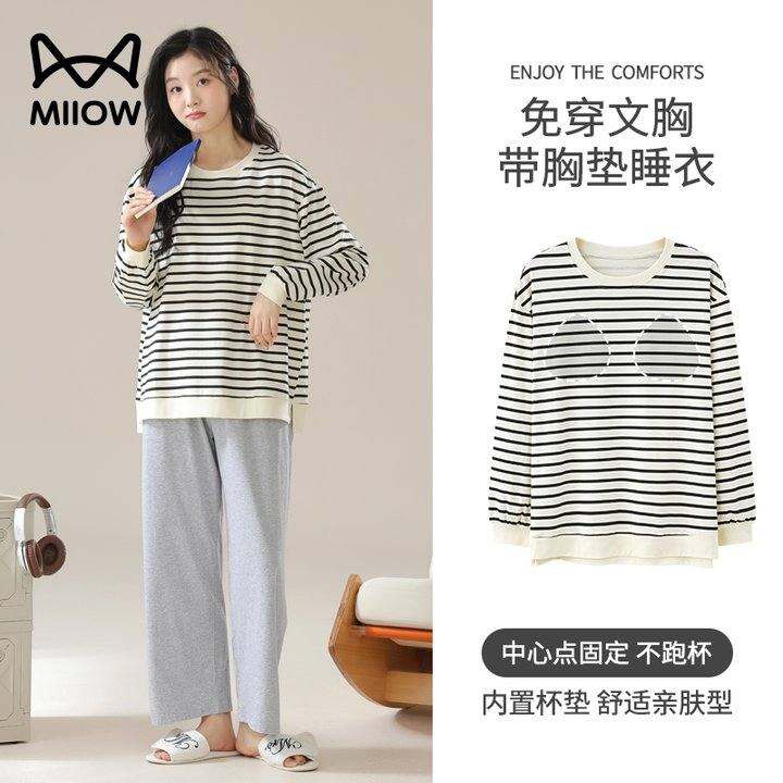 猫人睡衣女款2024新款春秋季家居服套装女长袖长裤棉绸带胸垫一体
