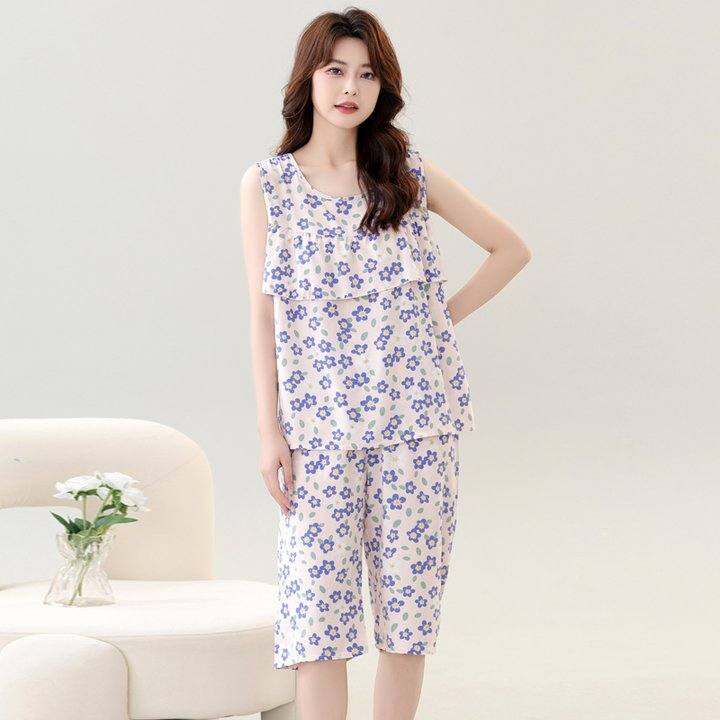 防凸点睡衣女套装夏天薄款棉绸背心短裤无袖套装绵绸防走光家居服