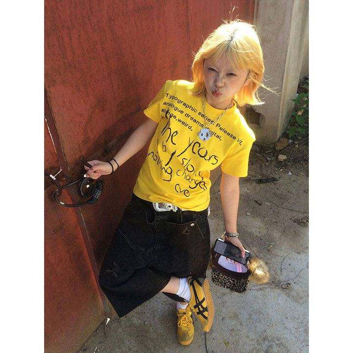 夏日多巴胺正肩短袖女字母印花美式重磅纯棉T恤修身显瘦辣妹上衣
