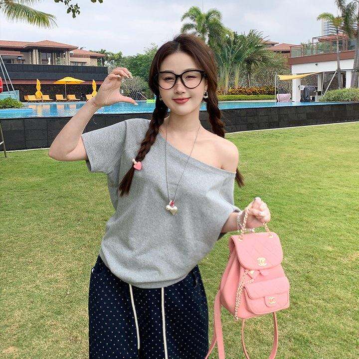 苏三三斜肩上衣女夏季2025新款高级感露肩灰色短袖t恤宽松一字肩