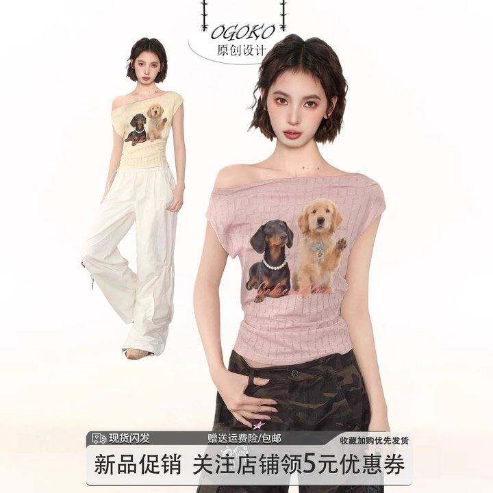 粉色小狗斜肩露肩短袖t恤女夏季设计感收腰修身一字肩短款小上衣