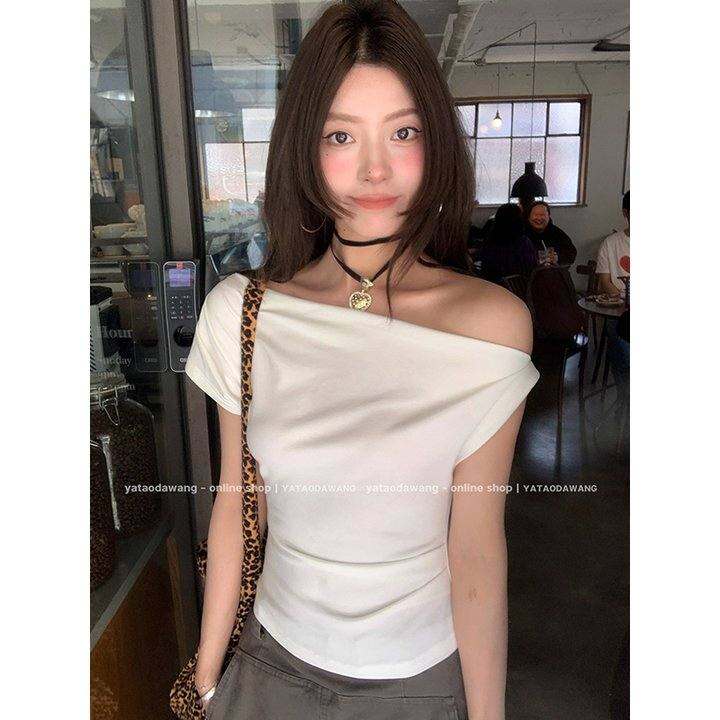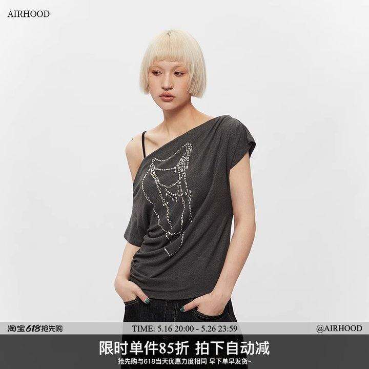 AIRHOOD 2025夏季新款一字领纯欲辣妹短袖T恤斜肩短款露肩上衣女