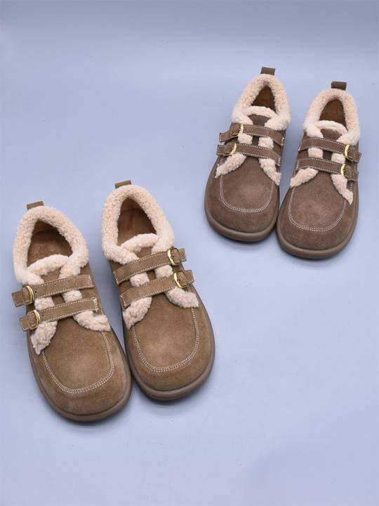 百搭真皮软底休闲鞋保暖英伦冬季百搭软底一脚蹬牛皮低跟短绒棉鞋