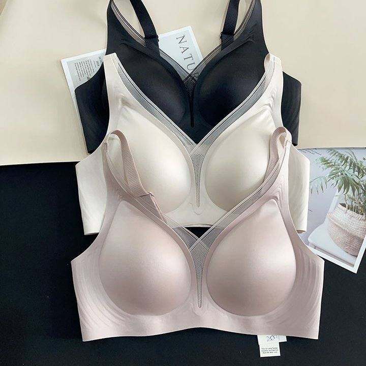 新款光面无痕半固定薄杯舒适透气内衣女网纱V领聚拢收副乳文胸罩