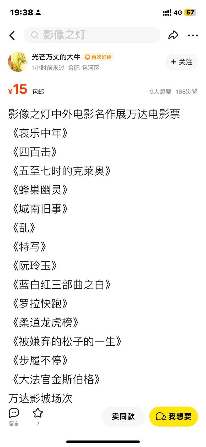 艺联的“影像之灯”活动,片单很不错,还有海报可以领。可以在闲鱼看看票,我原价55买了一张黑泽明,今天才发现闲鱼便宜一半!