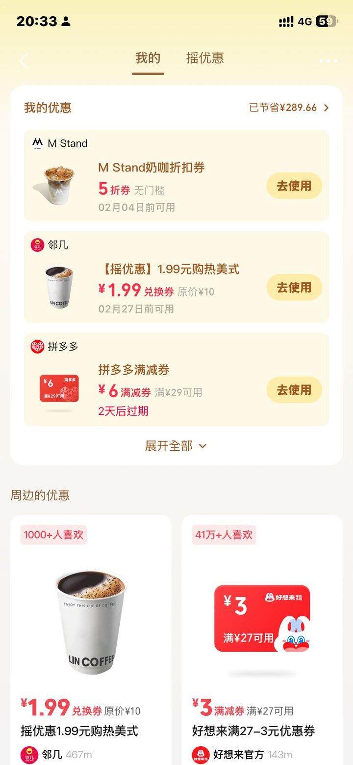 再分享一个,微信支付摇优惠,有拼多多满减券、便利店咖啡券,有的还挺划算