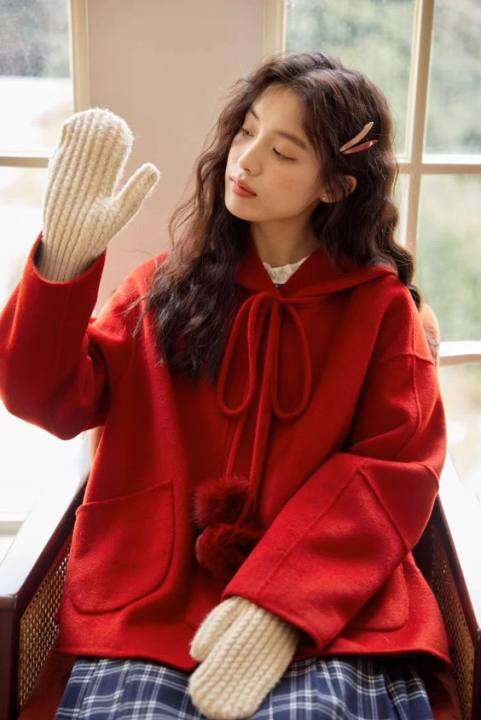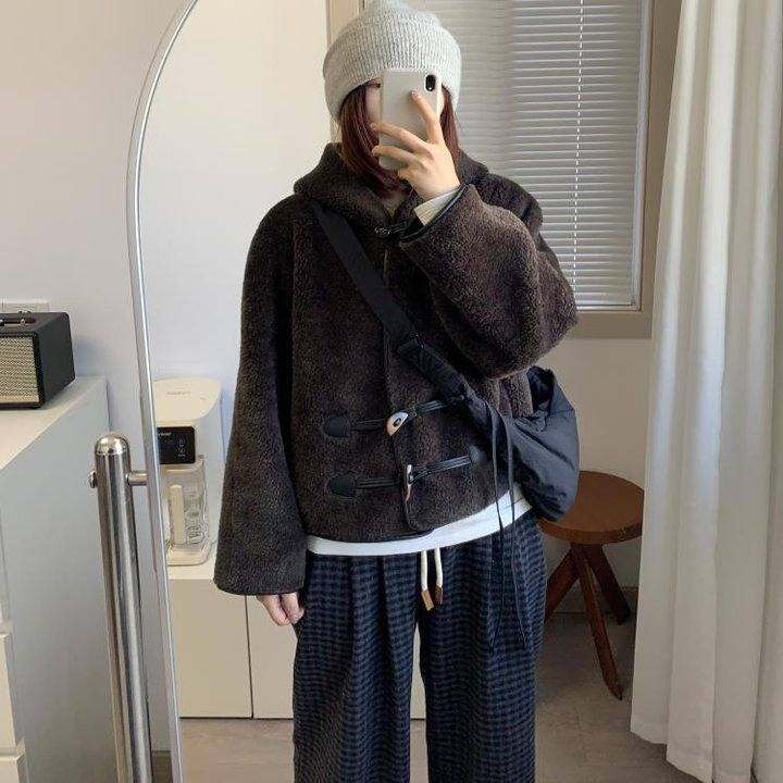 斗篷连帽牛角扣宽松茧型羊羔毛外套