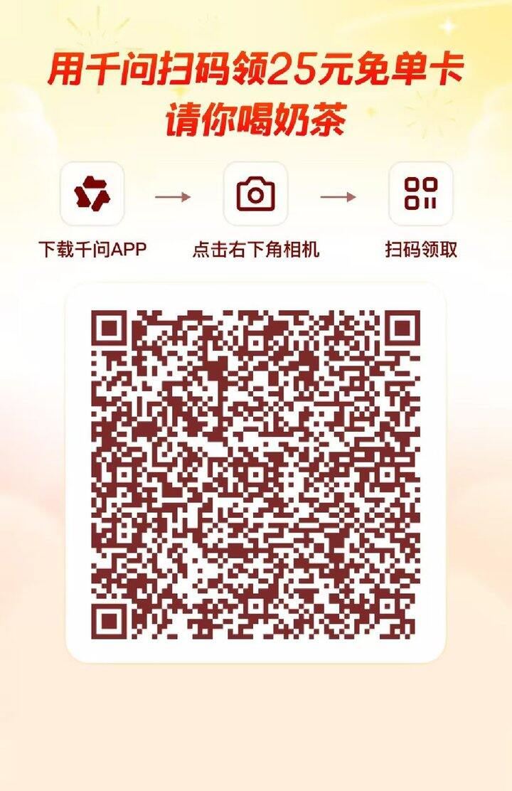 千问25元免单券,有效期到2月23,快囤起来。先下载千问,再去扫第一个码,然后2.23钱记得点奶茶用了就可以了,不明白问我哈!薅一波羊毛,每个手机号都可以领[跳跳]