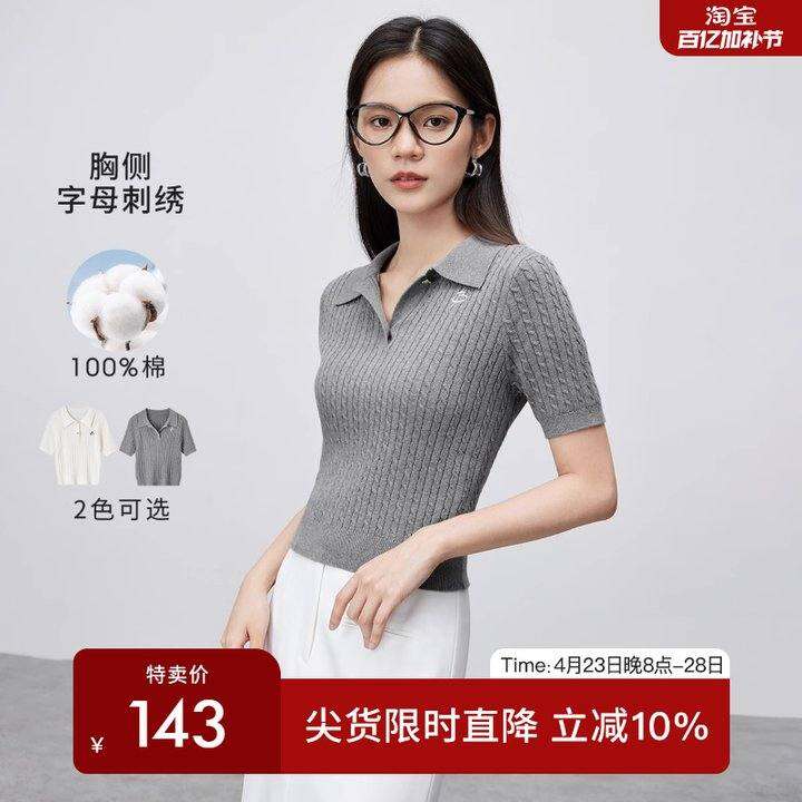 【抗起球】纯棉撞色POLO领针织衫女2025夏季新款弹力纯色短袖上衣