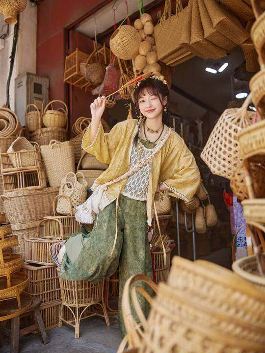前几天狗东6.18第一波到手290全套,面料虽不咋地但价格挺香的,上身古灵精怪,搭配个香料贩梦者包包更绝。今年汉服国风圈都在出灯笼裤,还是觉得这套黄绿配色无人能敌