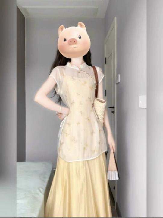 两件都是莱赛尔天丝面料,说是工厂同源,抖搜:【mimius】&游鹿鹿【南枝独绝】新中式禅意罩衫+吊带裙套装 F06255。详情有尺码表