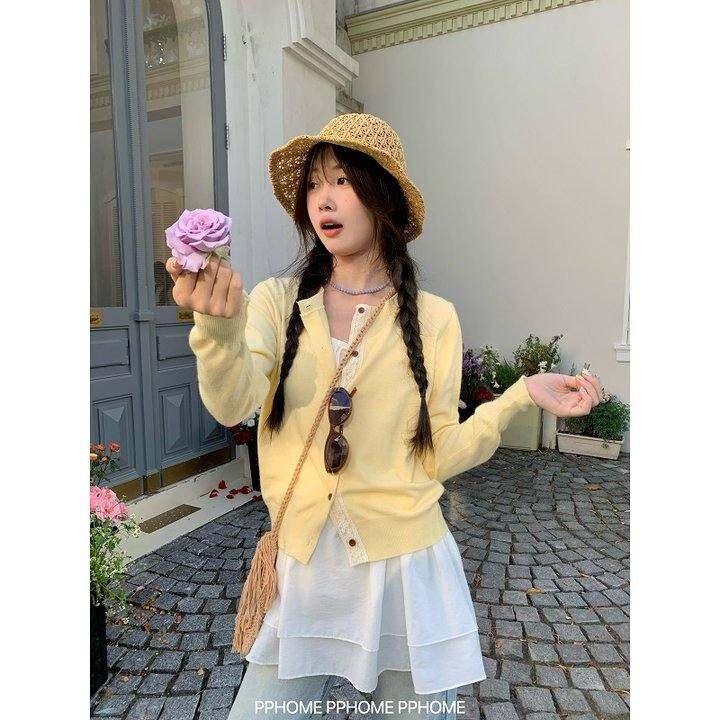 PPHOME自制~明媚春日 蕾丝拼接软糯针织开衫早春薄款毛衣外套上衣