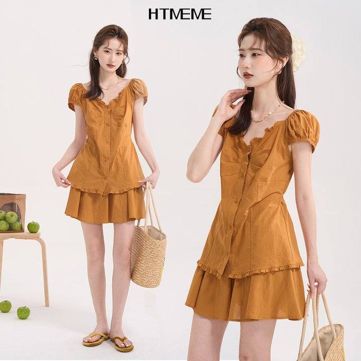 花田橱窗HTmeme清纯夏日复古花边短袖衬衣半身裙两件套装女洗水棉