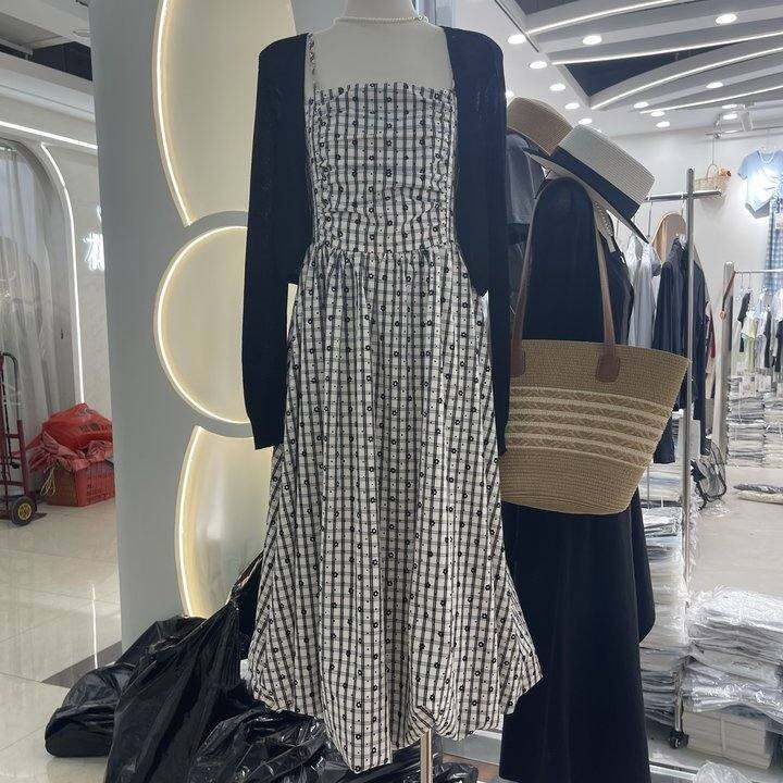 法式复古减龄格纹吊带连衣裙针织披肩开衫两件套女2025春夏新品