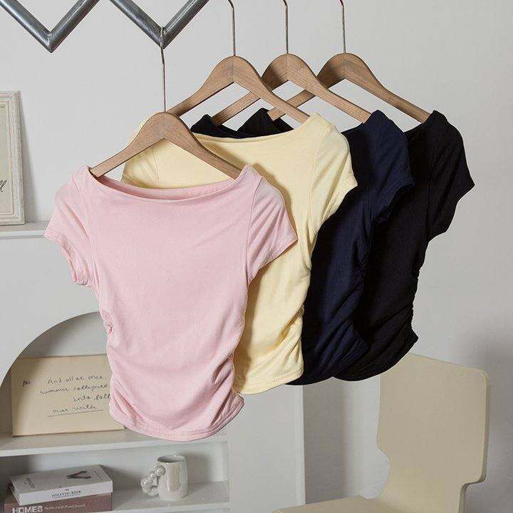 美式甜妹~完全柔软同料双层!纯色船领短袖无痕弹力T恤女上衣外贸