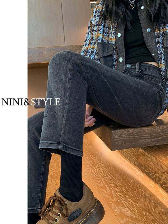 黑灰色直筒牛仔裤女秋冬2023年新款小个子高腰显瘦加绒烟管裤秋季