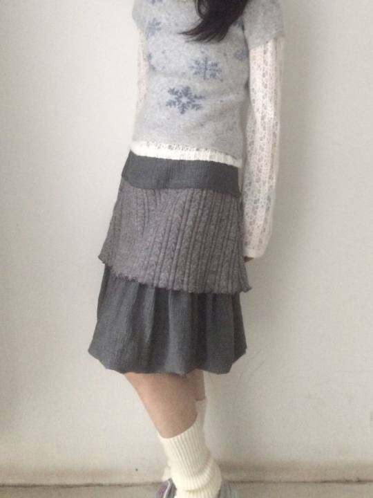 SicAstra 原创秋冬灰色复古针织拼接花苞褶皱半身裙A字裙