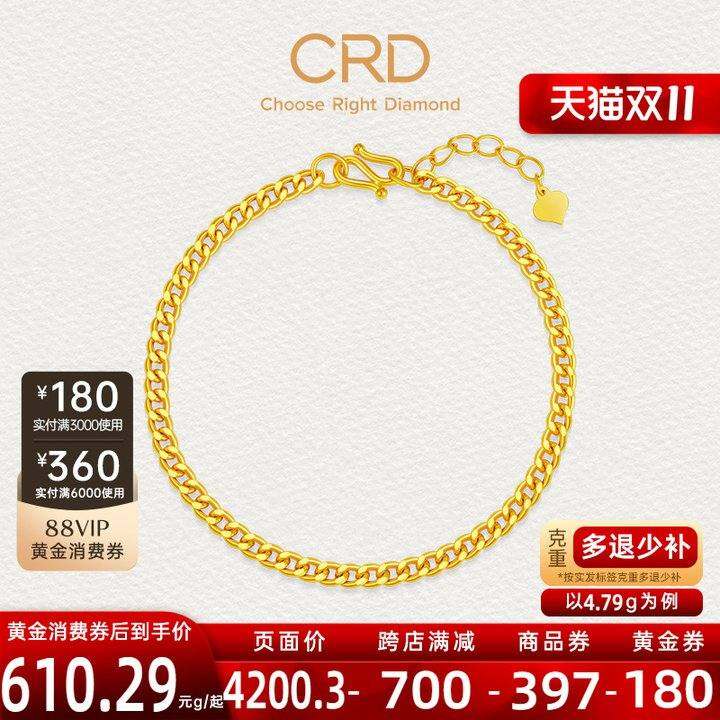 CRD克徕帝侧身链黄金手链足金999素链细手串实心手饰女喜平链三金