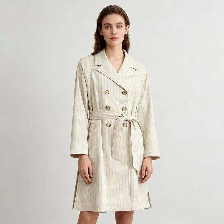 外贸欧美单时尚女装风衣秋季新款翻领双排扣条纹气质长款外套