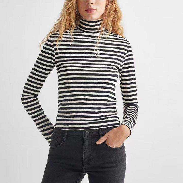 外贸欧美单女士打底衫秋冬季新款高领套头弹力修身条纹薄款针织衫