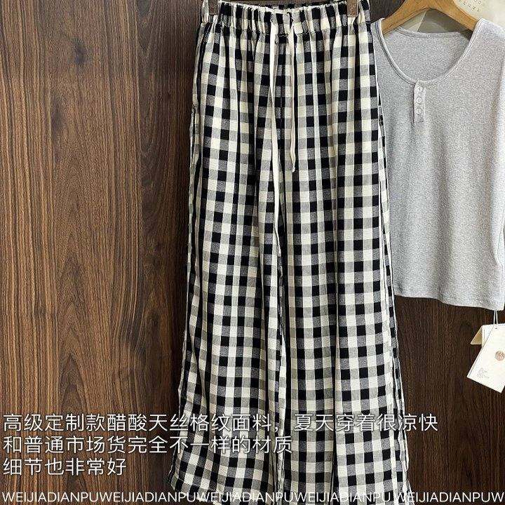 唯家醋酸天SI定制黑白格慵懒风阔腿裤女夏季新款高腰直筒休闲长裤