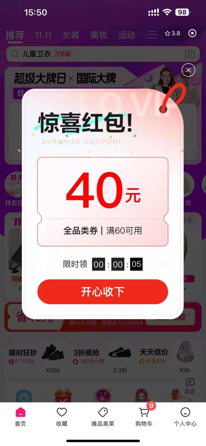 打开唯品会微信小程序,送了60减40全品,随便买点啥都行