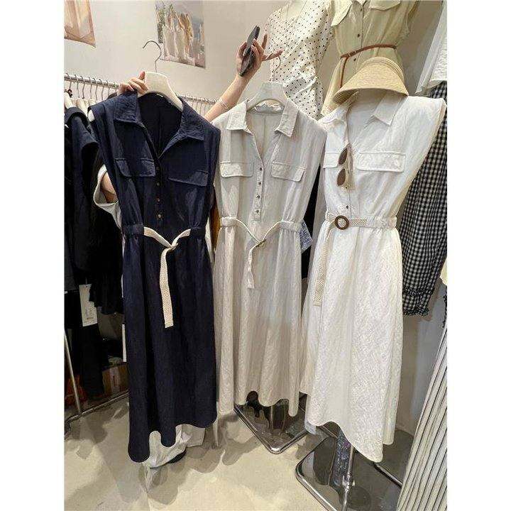 十三行2025夏季新款韩版翻领无袖连衣裙女收腰显瘦中长款a字裙子