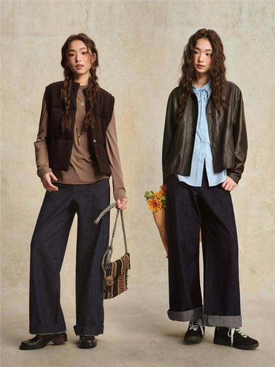 [卢正义明星款]佐丹奴秋冬新款慵懒高腰阔腿原色牛仔裤女18415914