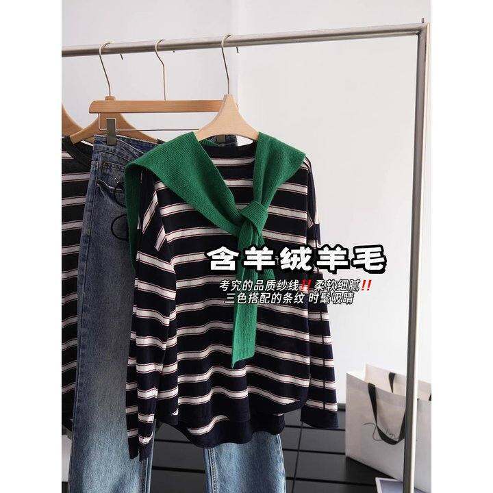 清仓lzichant 法式条纹针织衫大码女装宽松显瘦长袖圆领T恤春秋