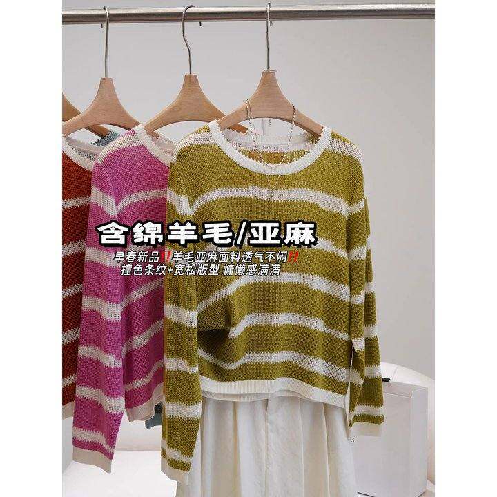 现货告别5折 含绵羊毛亚麻!镂空撞色条纹针织衫女早春<QZZG076