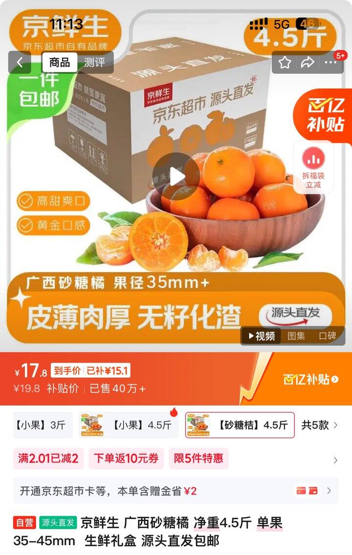 京鲜生 广西砂糖橘 净重4.5斤 单果35-45mm :