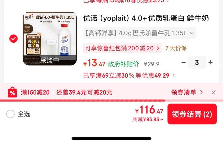 3,优诺4.0+优质乳蛋白 鲜牛奶巴氏杀菌鲜奶1.35L/桶