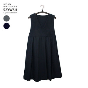 muji/lowrys farm简约V领毛呢高腰无袖中长款背心裙百褶连衣裙