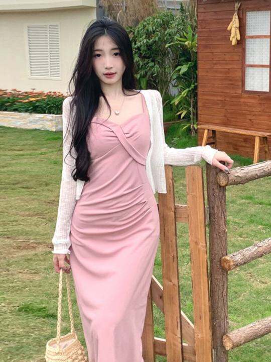 大码女装法式气质甜美设计感吊带连衣裙夏季胖mm收腰显瘦包臀长裙