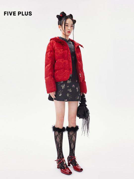 FIVE PLUS2023新款女春装中式盘扣羽绒服女国风宽松连帽外套提花