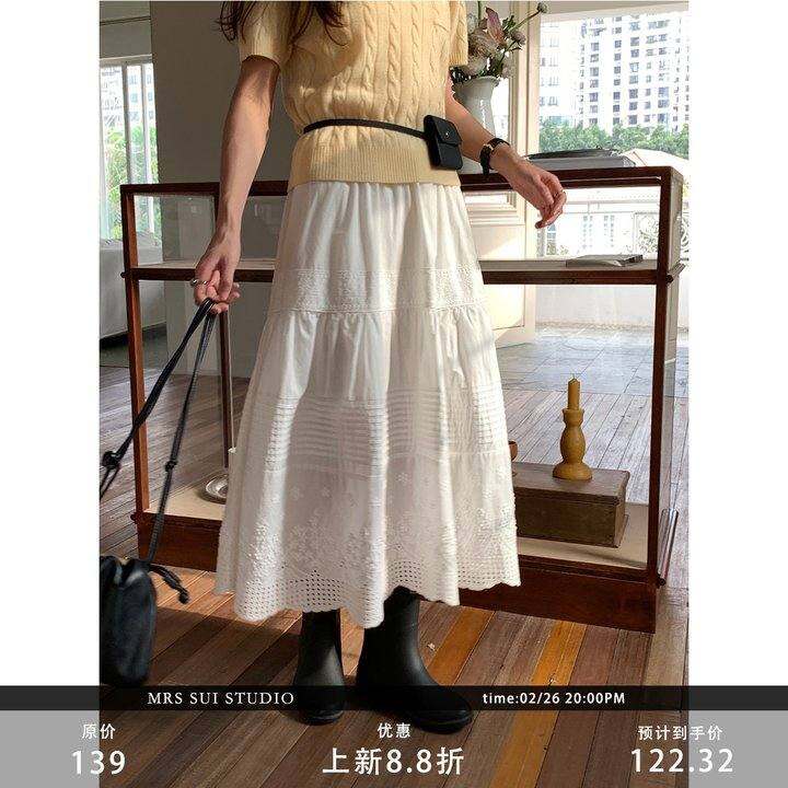 MRS SUI 2025款春夏重工法式 绣花拼接打揽半身裙白色A字长裙
