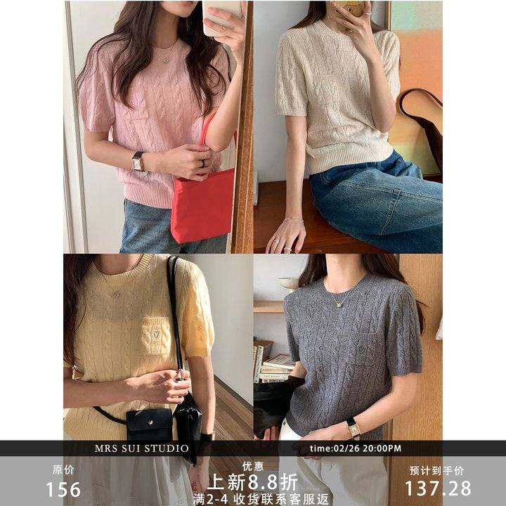 MRS SUI 2025春夏 4色圆领复古麻花短袖针织羊毛衫短款套头女