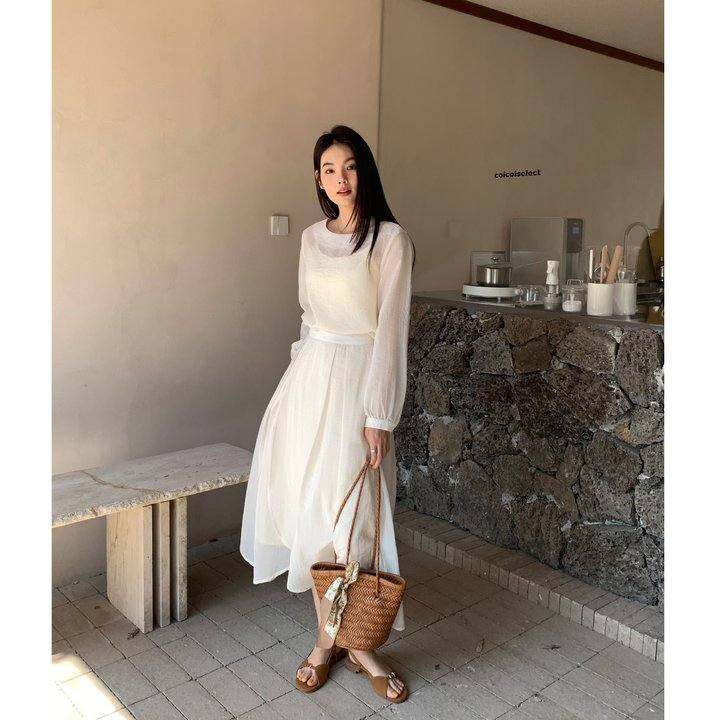 只拍到了上衣现货,薄,透,不沾身,正肩很显瘦,夏天穿很凉快,面料带走微微光泽感,上身很温柔,期待收到半裙搭一套