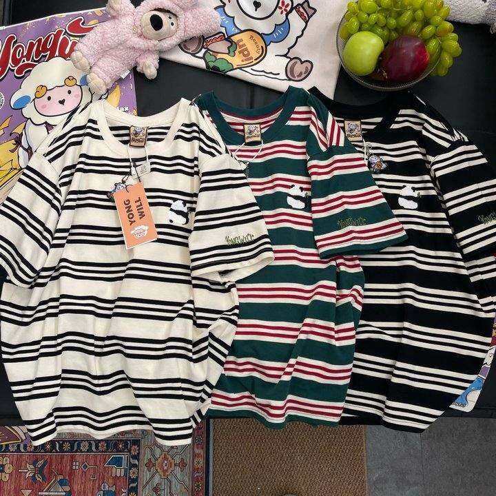 Yongwill小羊纸袋家纯棉撞色条纹短袖T恤女夏季凉感百搭刺绣半袖