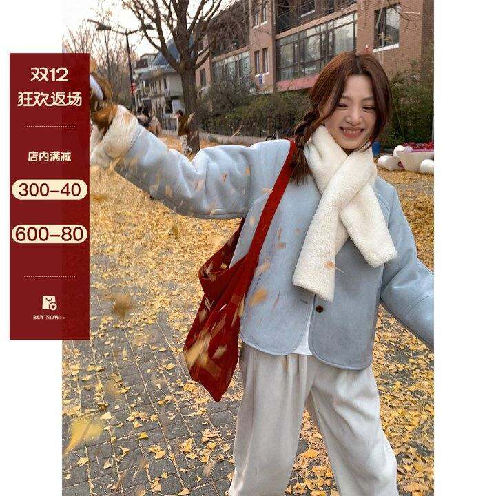 西西里安 粉芙少女~小个子韩系温柔带围巾麂皮毛一体短款小香外套