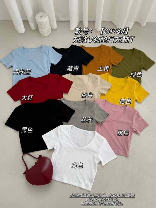 元熙3078正肩短袖上衣女夏季2025新款爆款U领百搭修身显瘦垫肩T恤