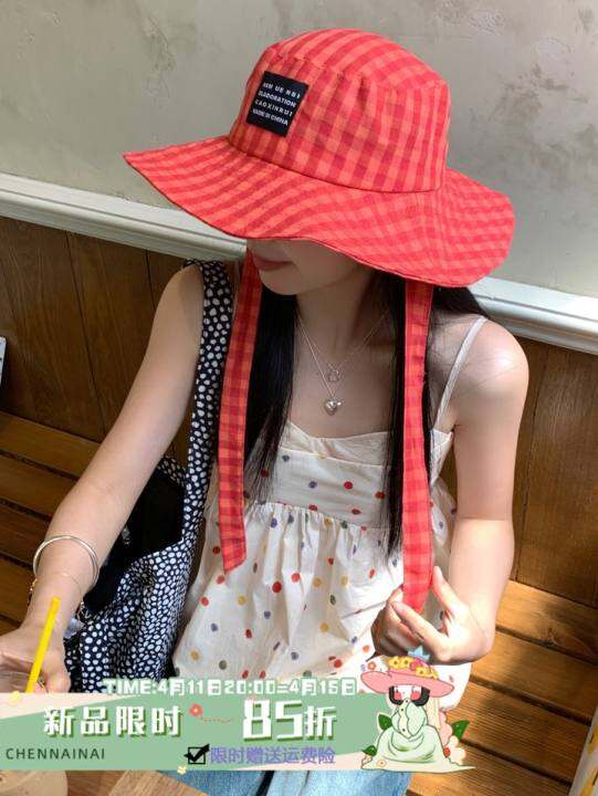 陈奶奶/夏日俏皮少女格子渔夫帽子女蝴蝶结绑带盆帽防晒遮阳帽